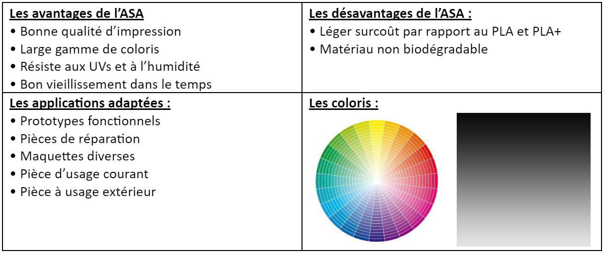 En effet l’ASA est un dérivé additivé de l’ABS lui permettant une très bonne résistance aux UVs tout en conservant toutes les propriétés de solidité de l’ABS.