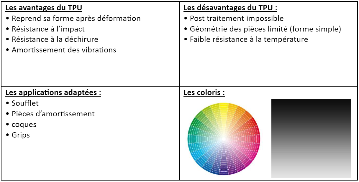 Les filaments flexibles TPU (élastomères) sont des matériaux d’impression 3D qui peuvent être utilisés comme un plastique flexible ou en remplacement de pièces de type caoutchoucs.