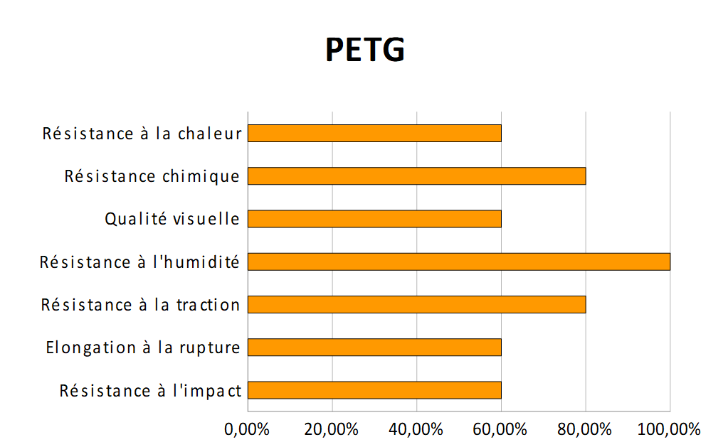 Avec une résistance située entre le PLA et l’ABS, il permet des impressions 3D durables, solides et particulièrement adaptées aux applications dans les environnements exigeants, car il ne craint ni les UVs ni l’humidité, et résiste aux produits chimiques.